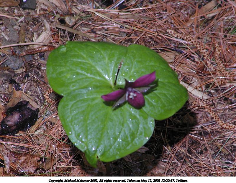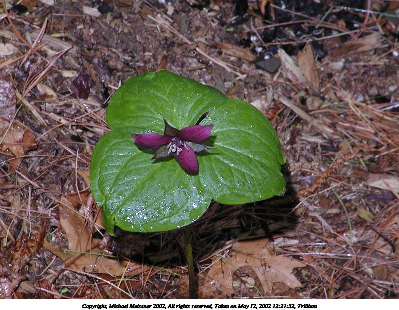 Picture #102: Trillium #2 800x622, 116,887 bytes (115K), (html file) Copyright, Michael Meissner 2002, All rights reserved Olympus C-2100UZ camera f/5.6, ISO 100, 1/125 sec, 45.8mm, manual mode, SHQ, matrix metering 35mm equivalent focal length 254.0mm Taken by Michael Meissner on May 12, 2002 12:21:32 Last modified on May 29, 2002 at 21:30 Shutter speed of 1/125 or 1/250 may indicate use of flash |