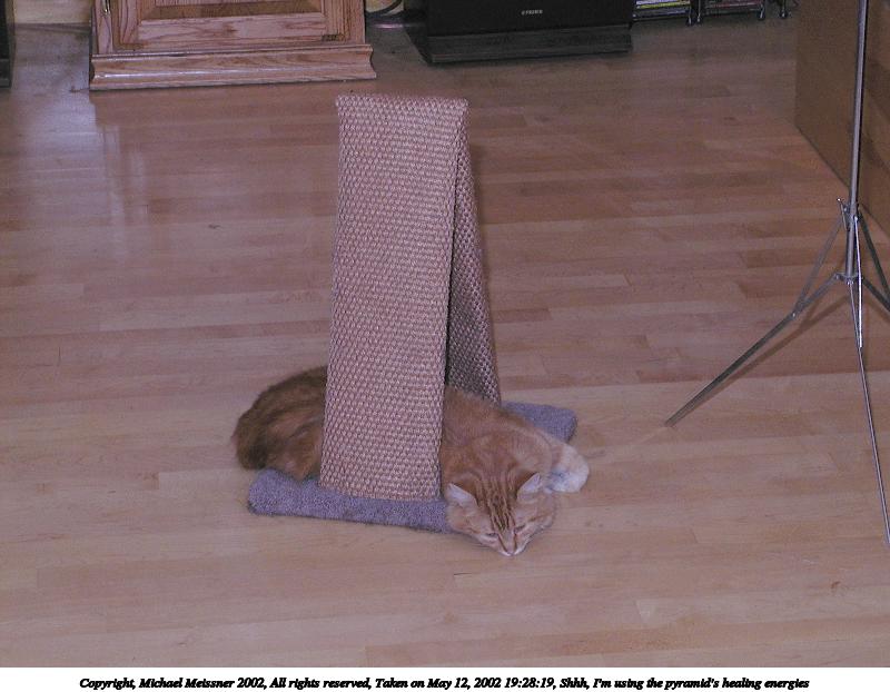 Picture #101: Shhh, I'm using the pyramid's healing energies 800x622, 65,031 bytes (64K), (html file) Copyright, Michael Meissner 2002, All rights reserved Olympus C-2100UZ camera f/5.6, ISO 100, 1/125 sec, 19.3mm, manual mode, SHQ, matrix metering 35mm equivalent focal length 107.0mm Taken by Michael Meissner on May 12, 2002 19:28:19 Last modified on May 29, 2002 at 21:30 Shutter speed of 1/125 or 1/250 may indicate use of flash |