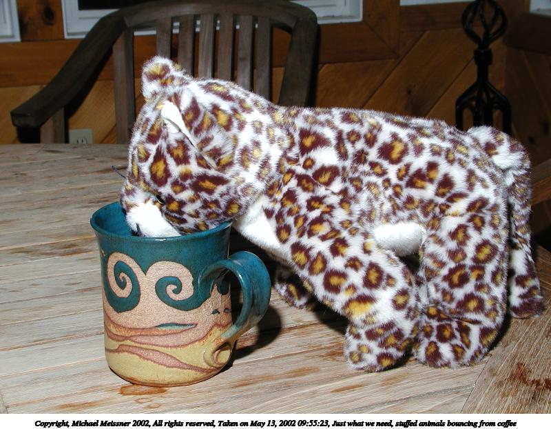 Picture #97: Just what we need, stuffed animals bouncing from coffee 800x622, 110,890 bytes (109K), (html file) Copyright, Michael Meissner 2002, All rights reserved Olympus C-2100UZ camera f/5.6, ISO 100, 1/125 sec, 12.0mm, manual mode, SHQ, matrix metering 35mm equivalent focal length 67.0mm Taken by Michael Meissner on May 13, 2002 09:55:23 Last modified on May 29, 2002 at 21:30 Shutter speed of 1/125 or 1/250 may indicate use of flash |