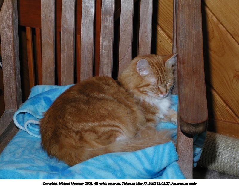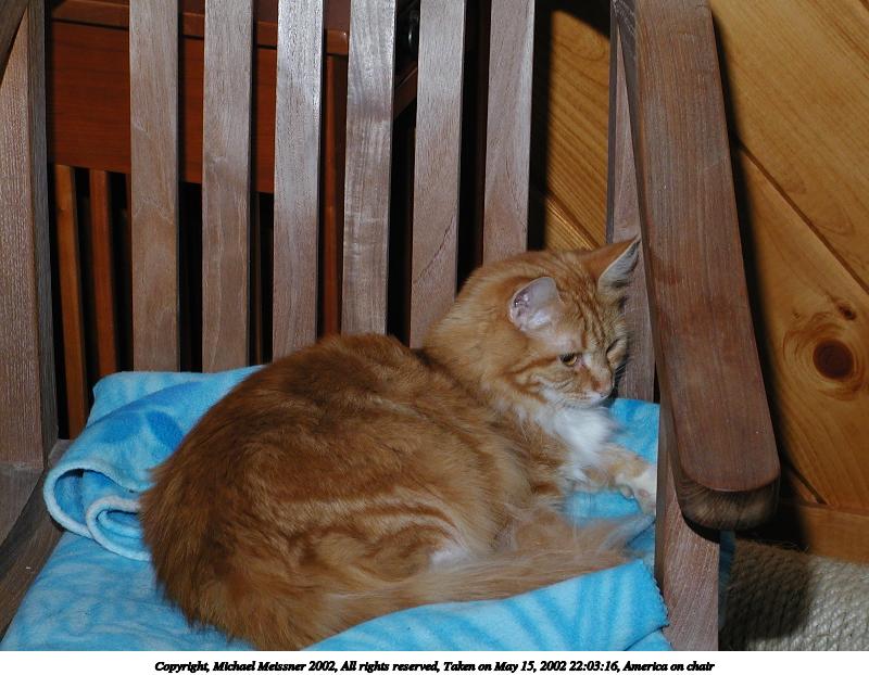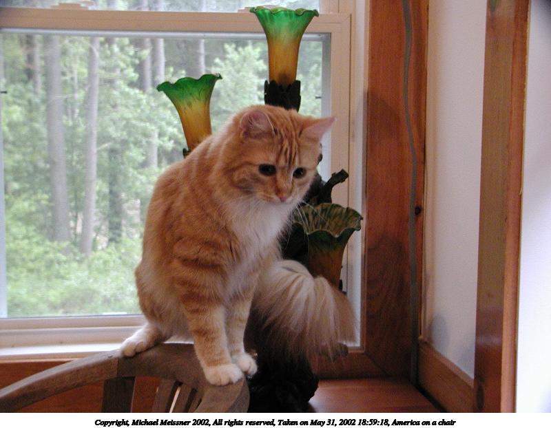 Picture #95: America on chair #2 800x622, 82,705 bytes (81K), (html file) Copyright, Michael Meissner 2002, All rights reserved Olympus C-2100UZ camera f/5.6, ISO 100, 1/125 sec, 22.3mm, manual mode, SHQ, matrix metering 35mm equivalent focal length 124.0mm Taken by Michael Meissner on May 15, 2002 22:03:27 Last modified on May 29, 2002 at 21:30 Shutter speed of 1/125 or 1/250 may indicate use of flash |