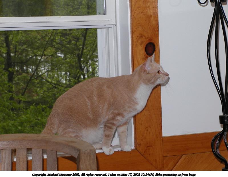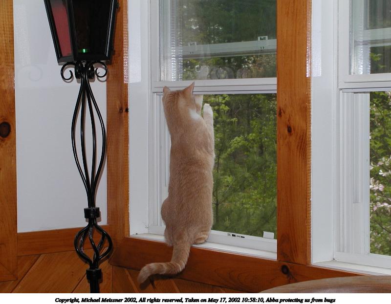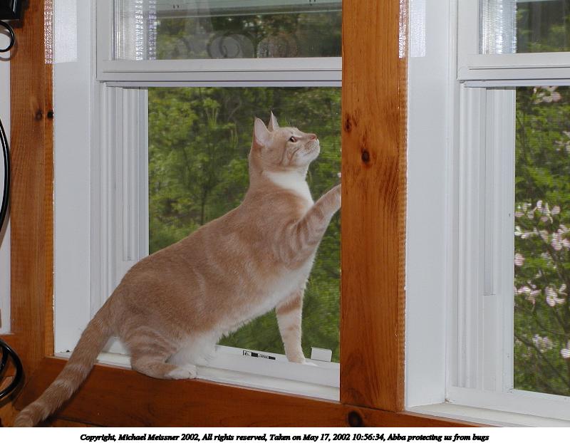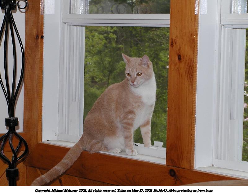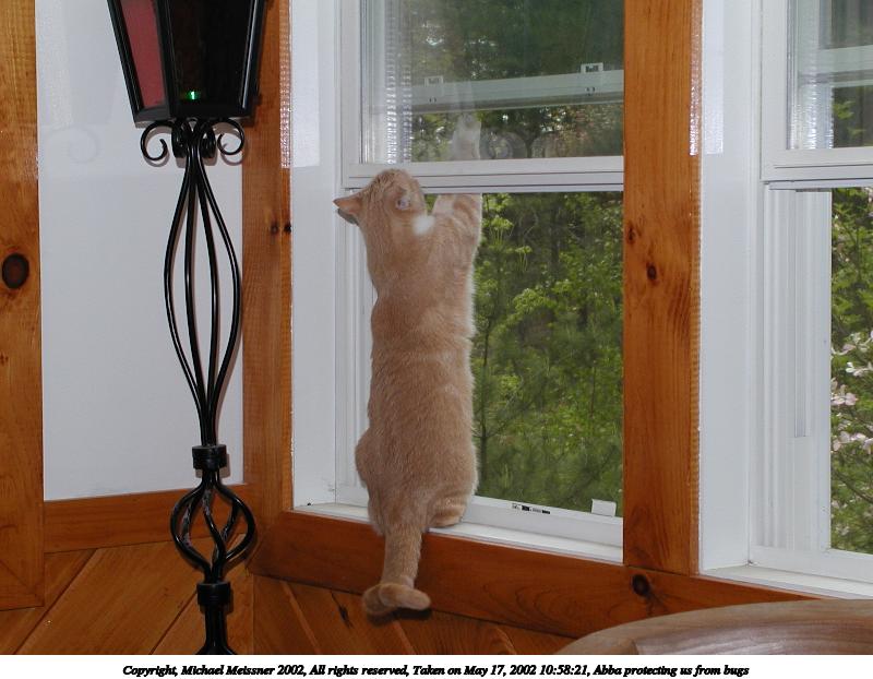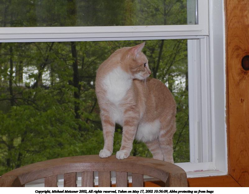 Picture #33: Abba protecting us from bugs #10 800x622, 71,984 bytes (71K), (html file) Copyright, Michael Meissner 2002, All rights reserved Olympus C-2100UZ camera f/5.6, ISO 100, 1/125 sec, 13.0mm, manual mode, SHQ, matrix metering 35mm equivalent focal length 72.0mm Taken by Michael Meissner on May 25, 2002 17:09:34 Last modified on May 29, 2002 at 21:31 Shutter speed of 1/125 or 1/250 may indicate use of flash |