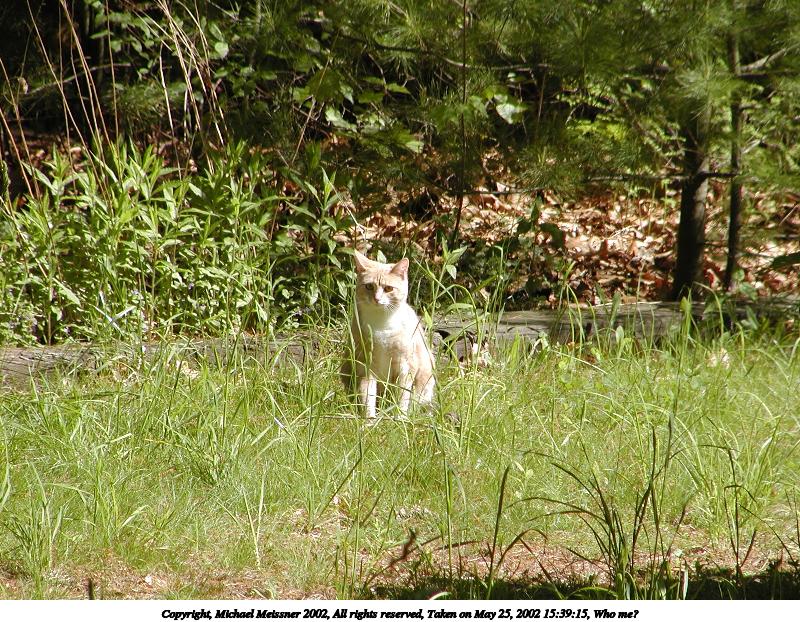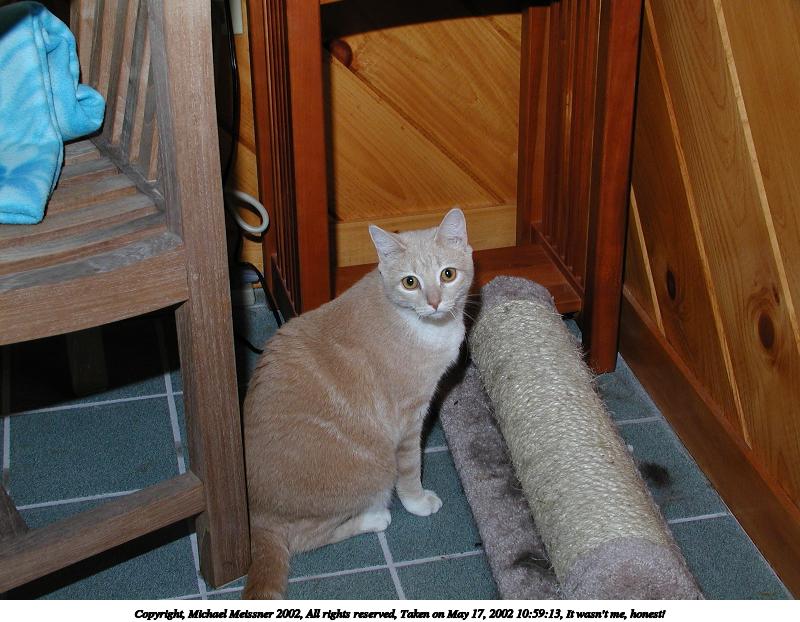 Picture #86: It wasn't me, honest! 800x622, 87,593 bytes (86K), (html file) Copyright, Michael Meissner 2002, All rights reserved Olympus C-2100UZ camera f/5.6, ISO 100, 1/125 sec, 11.3mm, manual mode, SHQ, matrix metering 35mm equivalent focal length 63.0mm Taken by Michael Meissner on May 17, 2002 10:59:13 Last modified on May 29, 2002 at 21:30 Shutter speed of 1/125 or 1/250 may indicate use of flash |
