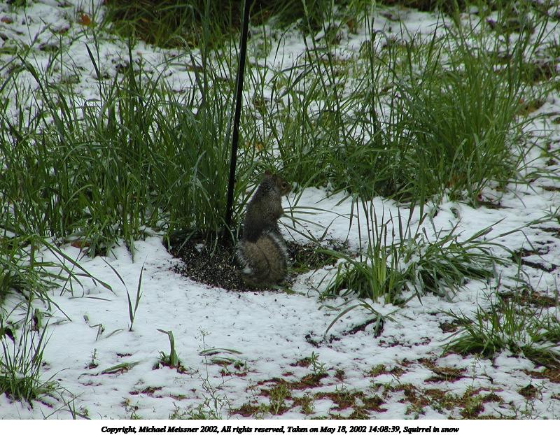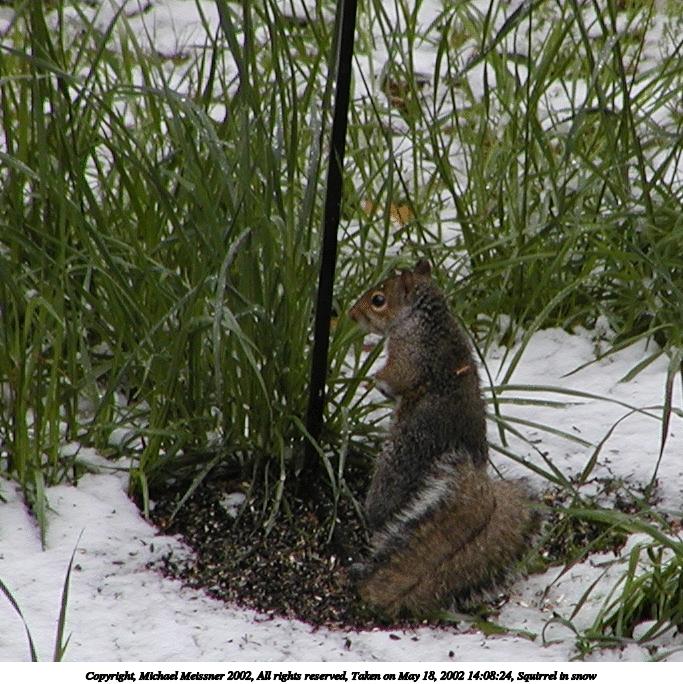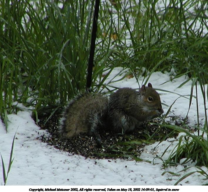 Picture #75: Squirrel in snow #4 708x653, 101,191 bytes (99K), (html file) Copyright, Michael Meissner 2002, All rights reserved Olympus C-2100UZ camera f/3.5, ISO 100, 1/650 sec, 70.0mm, auto mode, SHQ, sunny, matrix metering 35mm equivalent focal length 388.0mm Taken by Michael Meissner on May 18, 2002 14:09:01 Last modified on May 29, 2002 at 21:31 |