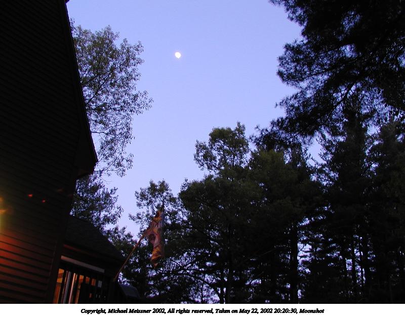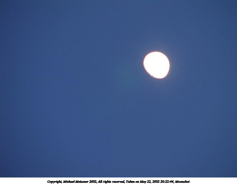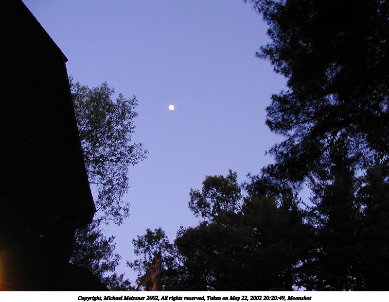 Picture #51: Moonshot #4 800x622, 75,735 bytes (74K), (html file) Copyright, Michael Meissner 2002, All rights reserved Olympus C-2100UZ camera f/2.8, ISO 100, 1/10 sec, 13.8mm, auto mode, SHQ, matrix metering 35mm equivalent focal length 77.0mm Taken by Michael Meissner on May 22, 2002 20:21:42 Last modified on May 29, 2002 at 21:31 |