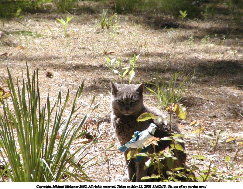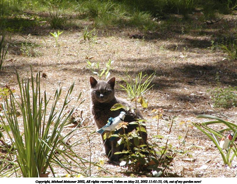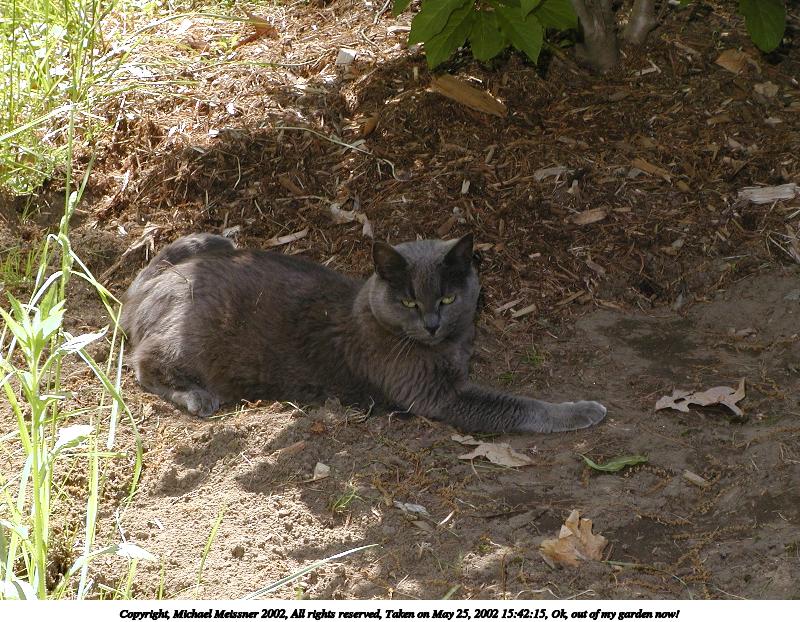 Picture #37: Ok, out of my garden now! #3 800x622, 155,223 bytes (152K), (html file) Copyright, Michael Meissner 2002, All rights reserved Olympus C-2100UZ camera f/5.6, ISO 100, 1/125 sec, 26.2mm, manual mode, SHQ, matrix metering 35mm equivalent focal length 145.0mm Taken by Michael Meissner on May 25, 2002 15:42:15 Last modified on May 29, 2002 at 21:31 Shutter speed of 1/125 or 1/250 may indicate use of flash |