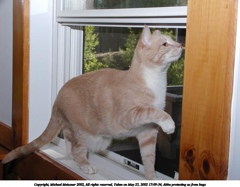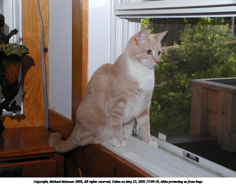 Picture #36: Abba protecting us from bugs #7 800x622, 74,338 bytes (73K), (html file) Copyright, Michael Meissner 2002, All rights reserved Olympus C-2100UZ camera f/5.6, ISO 100, 1/125 sec, 13.0mm, manual mode, SHQ, matrix metering 35mm equivalent focal length 72.0mm Taken by Michael Meissner on May 25, 2002 17:09:00 Last modified on May 29, 2002 at 21:31 Shutter speed of 1/125 or 1/250 may indicate use of flash |