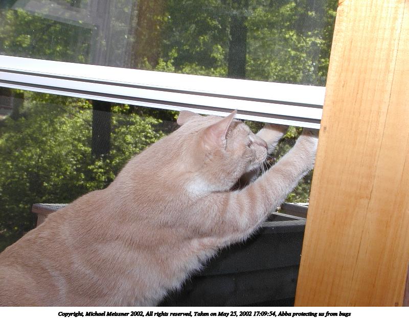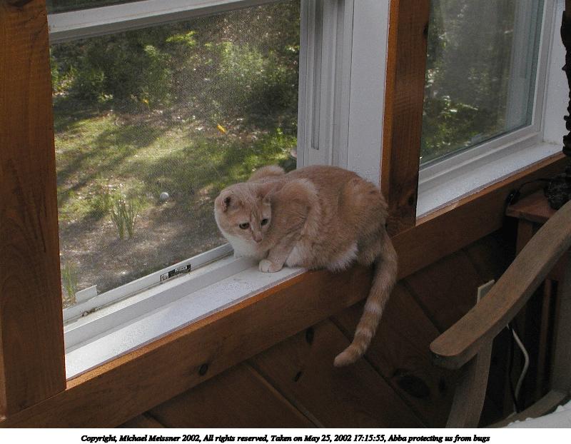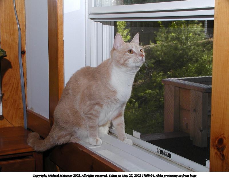 Picture #32: Abba protecting us from bugs #11 800x622, 94,150 bytes (92K), (html file) Copyright, Michael Meissner 2002, All rights reserved Olympus C-2100UZ camera f/5.6, ISO 100, 1/125 sec, 13.0mm, manual mode, SHQ, matrix metering 35mm equivalent focal length 72.0mm Taken by Michael Meissner on May 25, 2002 17:09:54 Last modified on May 29, 2002 at 21:31 Shutter speed of 1/125 or 1/250 may indicate use of flash |