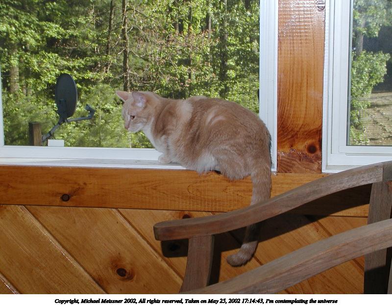 Picture #31: I'm contemplating the universe 800x622, 105,204 bytes (103K), (html file) Copyright, Michael Meissner 2002, All rights reserved Olympus C-2100UZ camera f/5.6, ISO 100, 1/125 sec, 13.0mm, manual mode, SHQ, matrix metering 35mm equivalent focal length 72.0mm Taken by Michael Meissner on May 25, 2002 17:14:43 Last modified on May 29, 2002 at 21:31 Shutter speed of 1/125 or 1/250 may indicate use of flash |