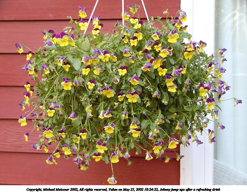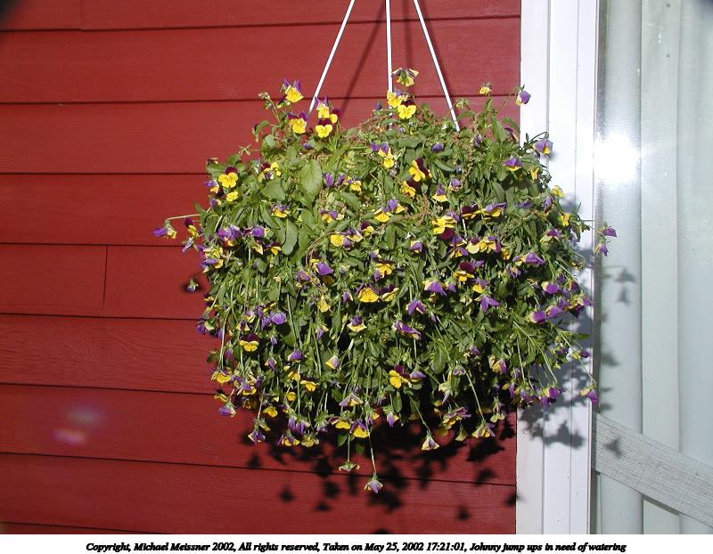 Picture #29: Johnny jump ups in need of watering 800x622, 105,621 bytes (104K), (html file) Copyright, Michael Meissner 2002, All rights reserved Olympus C-2100UZ camera f/5.6, ISO 100, 1/125 sec, 9.9mm, manual mode, SHQ, matrix metering 35mm equivalent focal length 55.0mm Taken by Michael Meissner on May 25, 2002 17:21:01 Last modified on May 29, 2002 at 21:31 Shutter speed of 1/125 or 1/250 may indicate use of flash |