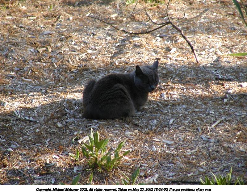 Picture #28: I've got problems of my own 800x622, 160,338 bytes (157K), (html file) Copyright, Michael Meissner 2002, All rights reserved Olympus C-2100UZ camera f/3.2, ISO 100, 1/125 sec, 57.3mm, auto mode, SHQ, matrix metering 35mm equivalent focal length 318.0mm Taken by Michael Meissner on May 25, 2002 18:24:00 Last modified on May 29, 2002 at 21:31 Shutter speed of 1/125 or 1/250 may indicate use of flash |