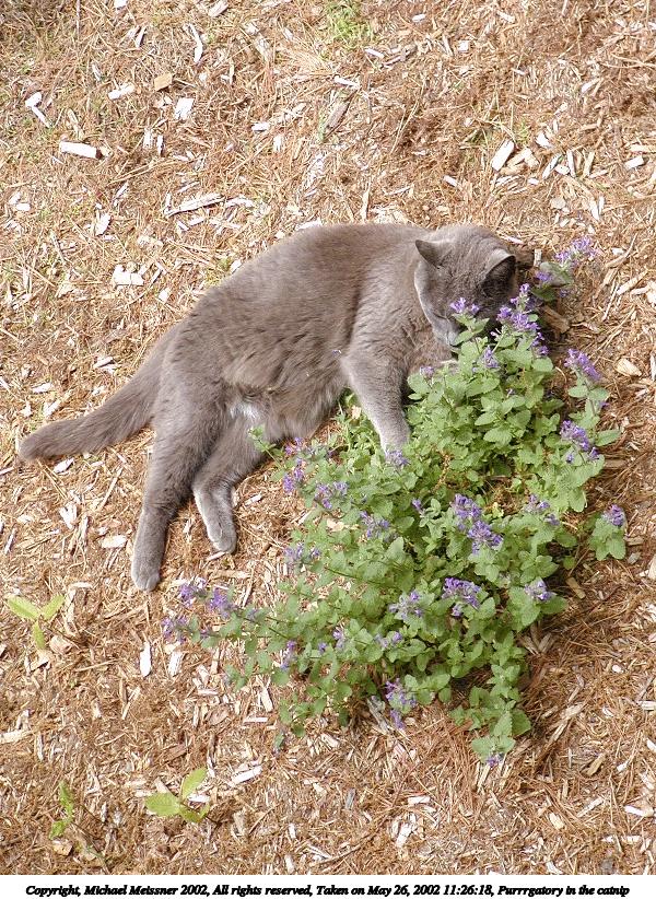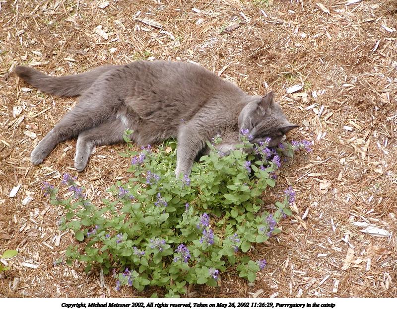 Picture #18: Purrrgatory in the catnip #2 800x622, 199,241 bytes (195K), (html file) Copyright, Michael Meissner 2002, All rights reserved Olympus C-2100UZ camera f/2.8, ISO 100, 1/500 sec, 28.5mm, auto mode, SHQ, matrix metering 35mm equivalent focal length 158.0mm Taken by Michael Meissner on May 26, 2002 11:26:29 Last modified on May 29, 2002 at 21:31 |