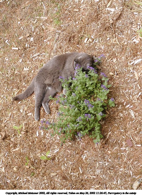 Picture #19: Purrrgatory in the catnip 600x822, 208,547 bytes (204K), (html file) Copyright, Michael Meissner 2002, All rights reserved Olympus C-2100UZ camera f/3.2, ISO 100, 1/500 sec, 28.5mm, auto mode, SHQ, matrix metering 35mm equivalent focal length 158.0mm Taken by Michael Meissner on May 26, 2002 11:26:18 Last modified on May 29, 2002 at 21:31 |