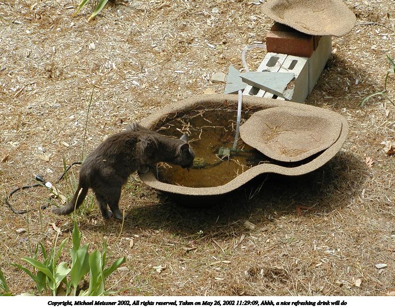 Picture #14: Ahhh, a nice refreshing drink will do 800x622, 173,582 bytes (170K), (html file) Copyright, Michael Meissner 2002, All rights reserved Olympus C-2100UZ camera f/3.2, ISO 100, 1/650 sec, 34.1mm, auto mode, SHQ, sunny, matrix metering 35mm equivalent focal length 189.0mm Taken by Michael Meissner on May 26, 2002 11:29:02 Last modified on May 29, 2002 at 21:31 |