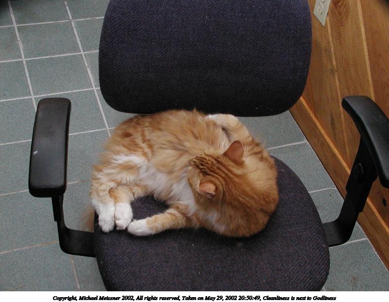 Picture #8: Cleanliness is next to Godliness 800x622, 88,639 bytes (87K), (html file) Copyright, Michael Meissner 2002, All rights reserved Olympus C-2100UZ camera f/5.6, ISO 400, 1/125 sec, 10.7mm, manual mode, SHQ, matrix metering 35mm equivalent focal length 59.0mm Taken by Michael Meissner on May 29, 2002 20:50:49 Last modified on June 01, 2002 at 22:22 Shutter speed of 1/125 or 1/250 may indicate use of flash |