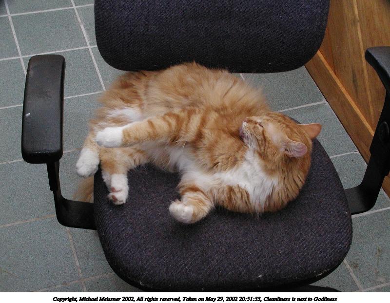 Picture #7: Cleanliness is next to Godliness #2 800x622, 88,800 bytes (87K), (html file) Copyright, Michael Meissner 2002, All rights reserved Olympus C-2100UZ camera f/5.6, ISO 400, 1/125 sec, 10.7mm, manual mode, SHQ, matrix metering 35mm equivalent focal length 59.0mm Taken by Michael Meissner on May 29, 2002 20:51:08 Last modified on June 01, 2002 at 22:23 Shutter speed of 1/125 or 1/250 may indicate use of flash |