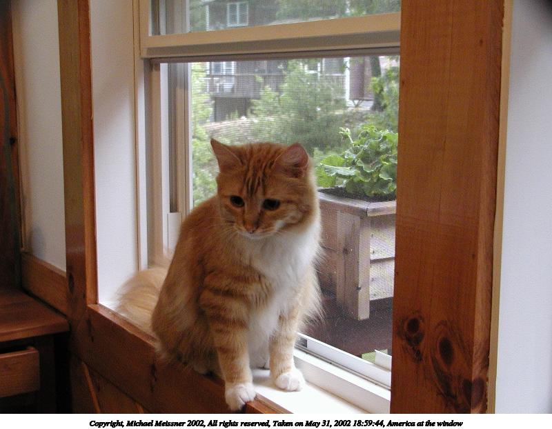 Picture #1: America at the window 800x622, 73,709 bytes (72K), (html file) Copyright, Michael Meissner 2002, All rights reserved Olympus C-2100UZ camera f/2.8, ISO 400, 1/40 sec, 9.9mm, auto mode, SHQ, matrix metering 35mm equivalent focal length 55.0mm Taken by Michael Meissner on May 31, 2002 18:59:44 Last modified on June 01, 2002 at 22:44 |