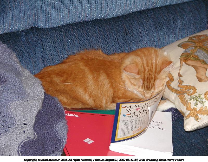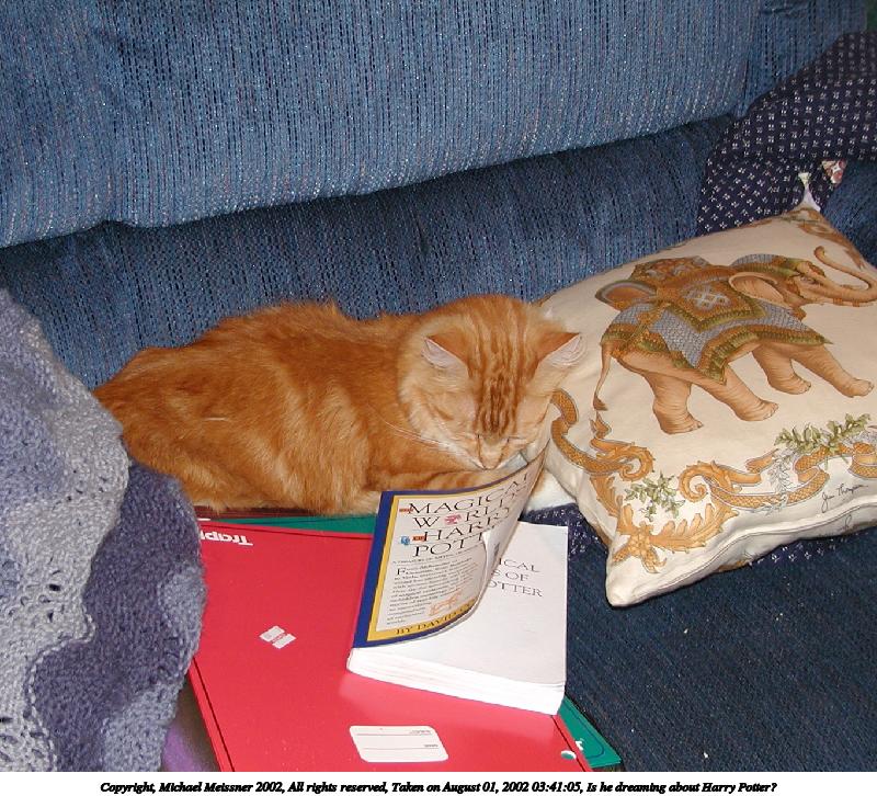 Picture #205: Is he dreaming about Harry Potter? 800x726, 141,493 bytes (139K), (html file) Copyright, Michael Meissner 2002, All rights reserved Olympus C-2100UZ camera f/2.8, ISO 100, flash, 1/50 sec, 12.3mm, auto mode, SHQ, matrix metering 35mm equivalent focal length 68.0mm Taken by Michael Meissner on August 01, 2002 03:41:05 Last modified on August 01, 2002 at 19:43 |
