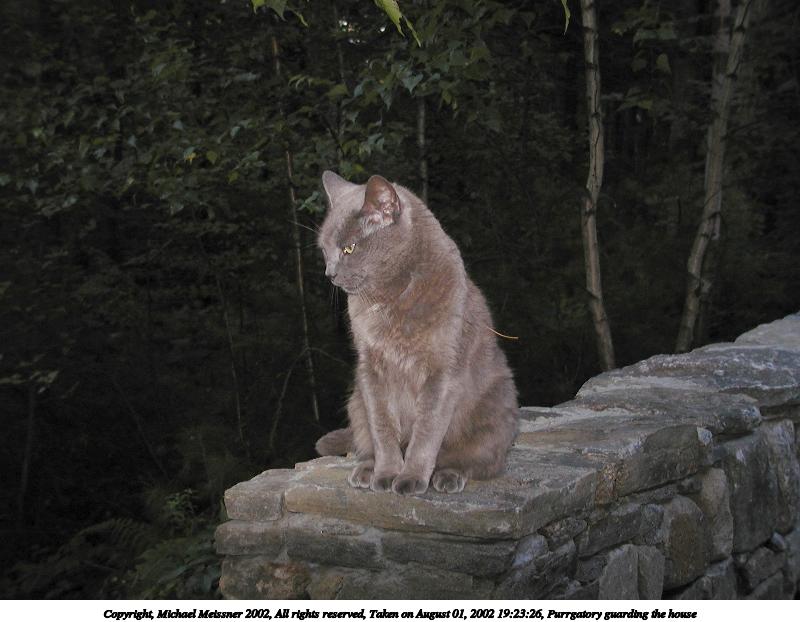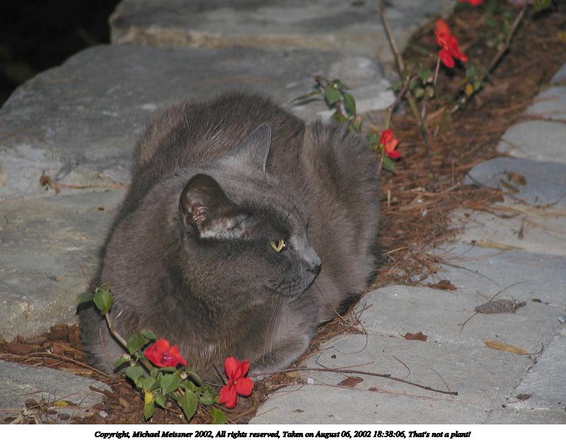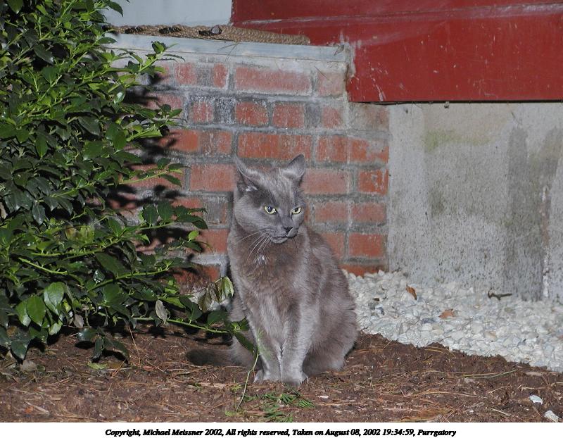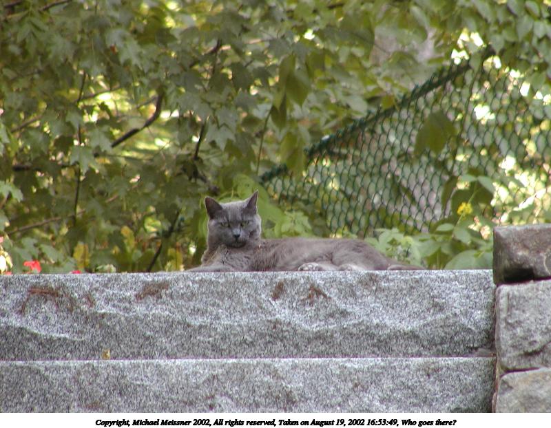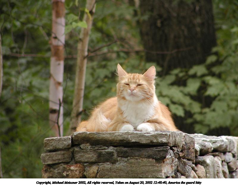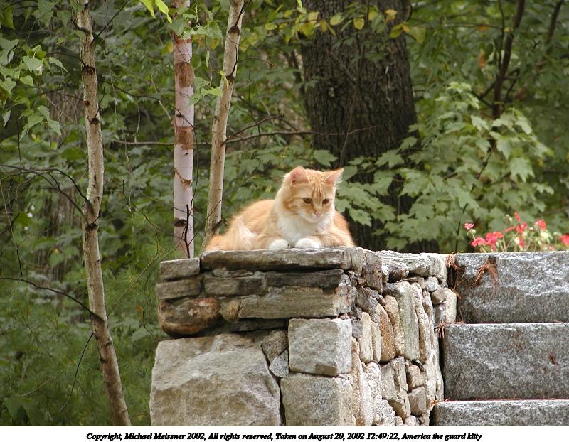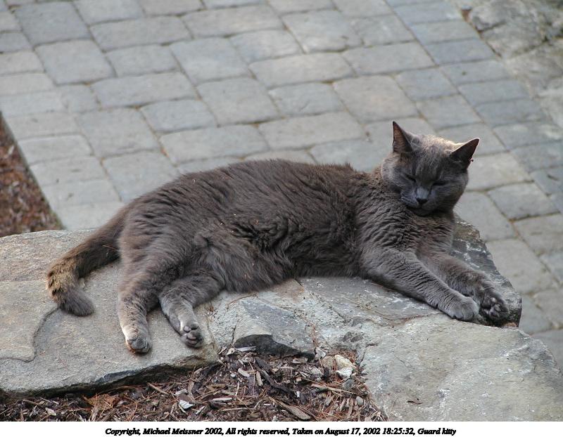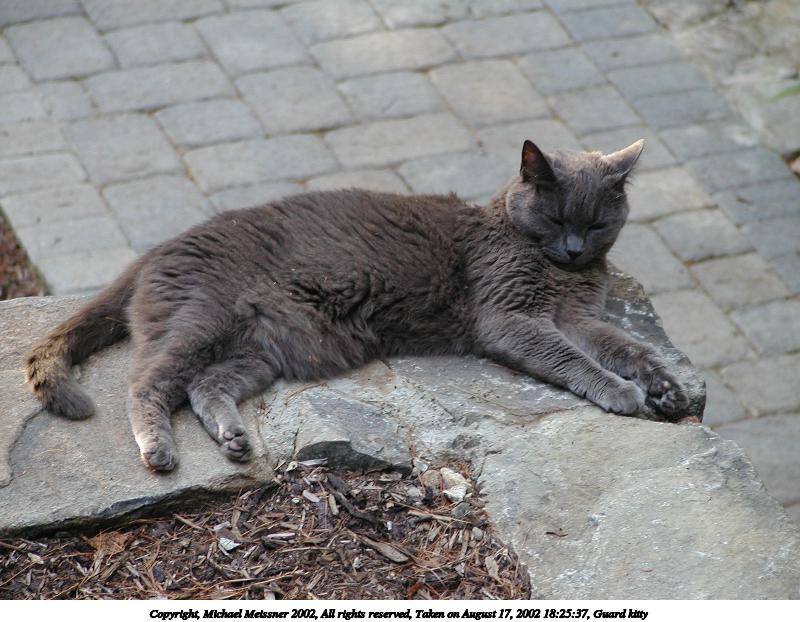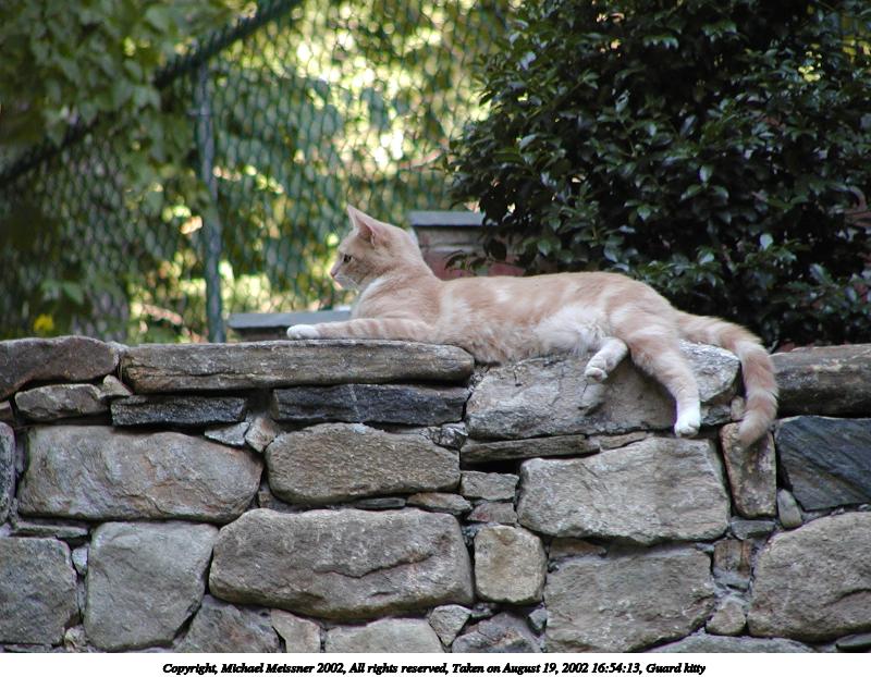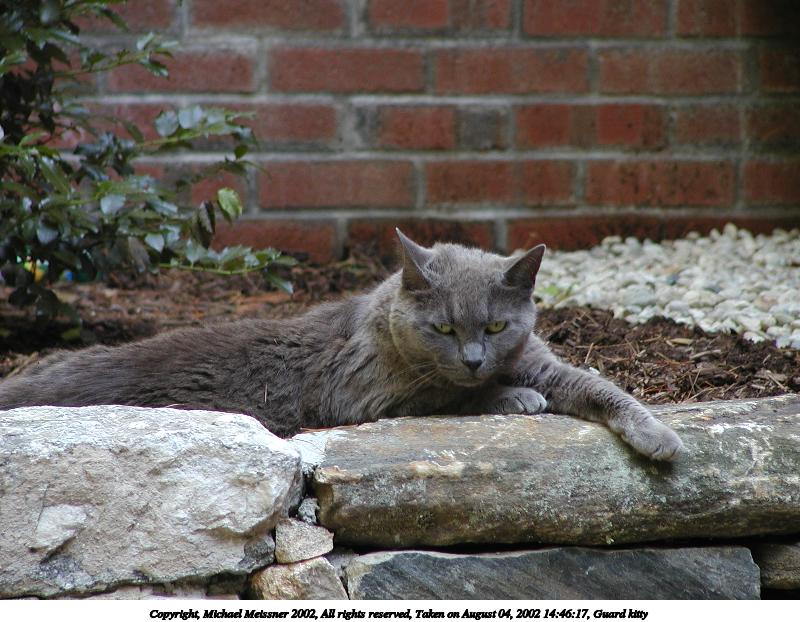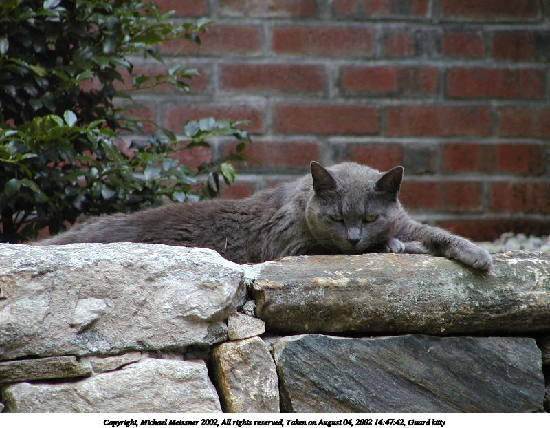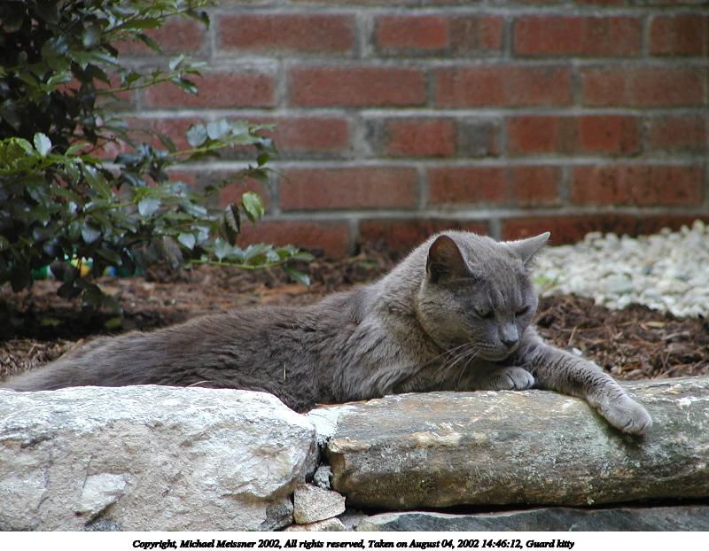 Picture #190: Guard kitty #3 800x622, 97,692 bytes (96K), (html file) Copyright, Michael Meissner 2002, All rights reserved Olympus C-2100UZ camera f/2.8, ISO 100, 1/125 sec, 48.3mm, auto mode, SHQ, matrix metering 35mm equivalent focal length 268.0mm Taken by Michael Meissner on August 04, 2002 14:47:42 Last modified on August 04, 2002 at 18:04 Shutter speed of 1/125 or 1/250 may indicate use of flash |