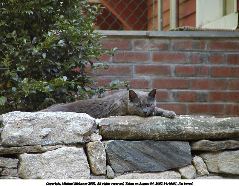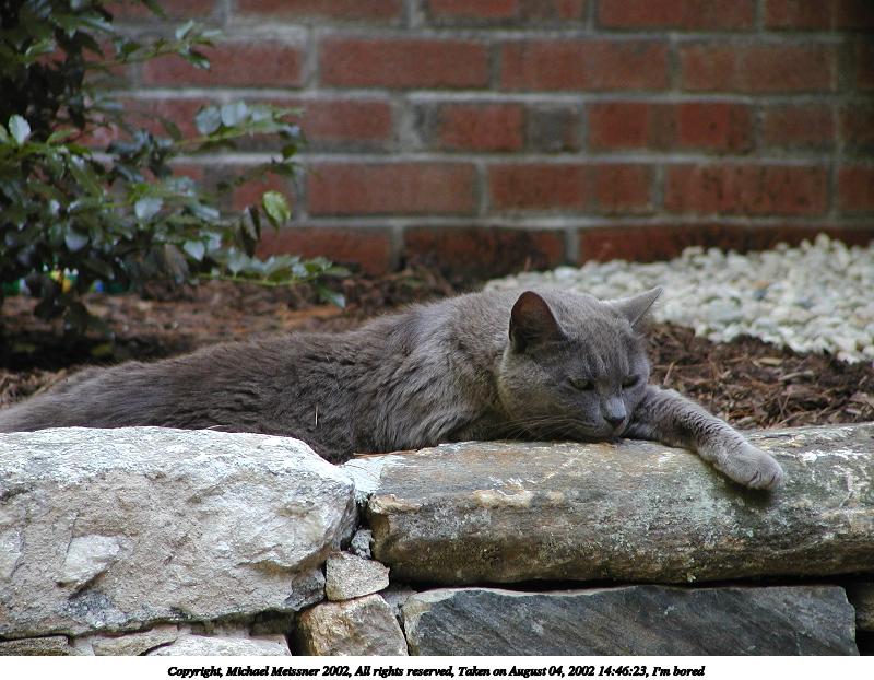 Picture #191: I'm bored #2 800x622, 101,416 bytes (100K), (html file) Copyright, Michael Meissner 2002, All rights reserved Olympus C-2100UZ camera f/2.8, ISO 100, 1/125 sec, 43.5mm, auto mode, SHQ, matrix metering 35mm equivalent focal length 241.0mm Taken by Michael Meissner on August 04, 2002 14:46:23 Last modified on August 04, 2002 at 18:04 Shutter speed of 1/125 or 1/250 may indicate use of flash |