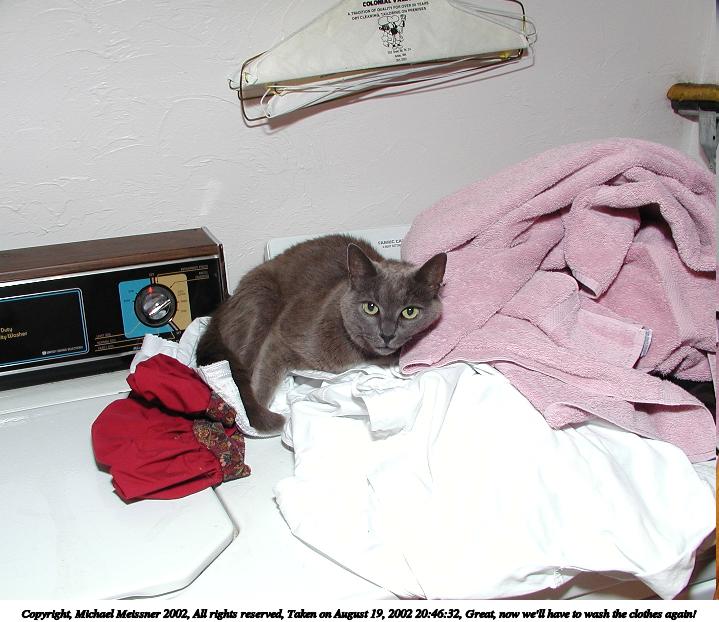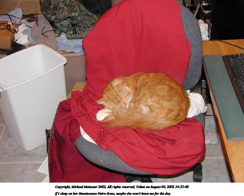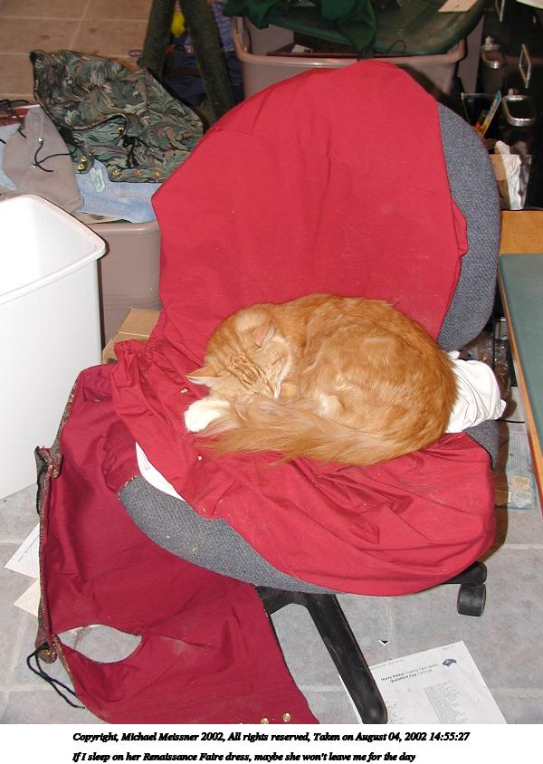 Picture #189: If I sleep on her Renaissance Faire dress, maybe she won't leave me for the day 600x844, 82,534 bytes (81K), (html file) Copyright, Michael Meissner 2002, All rights reserved Olympus C-2100UZ camera f/2.8, ISO 100, flash, 1/40 sec, 9.4mm, auto mode, SHQ, matrix metering 35mm equivalent focal length 52.0mm Taken by Michael Meissner on August 04, 2002 14:55:27 Last modified on August 04, 2002 at 18:06 |