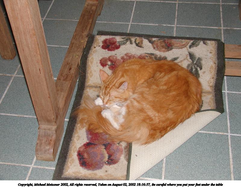 Picture #187: Be careful where you put your feet under the table 800x622, 106,019 bytes (104K), (html file) Copyright, Michael Meissner 2002, All rights reserved Olympus C-2100UZ camera f/2.8, ISO 100, flash, 1/40 sec, 9.7mm, auto mode, SHQ, matrix metering 35mm equivalent focal length 54.0mm Taken by Michael Meissner on August 02, 2002 18:16:37 Last modified on August 04, 2002 at 21:19 |