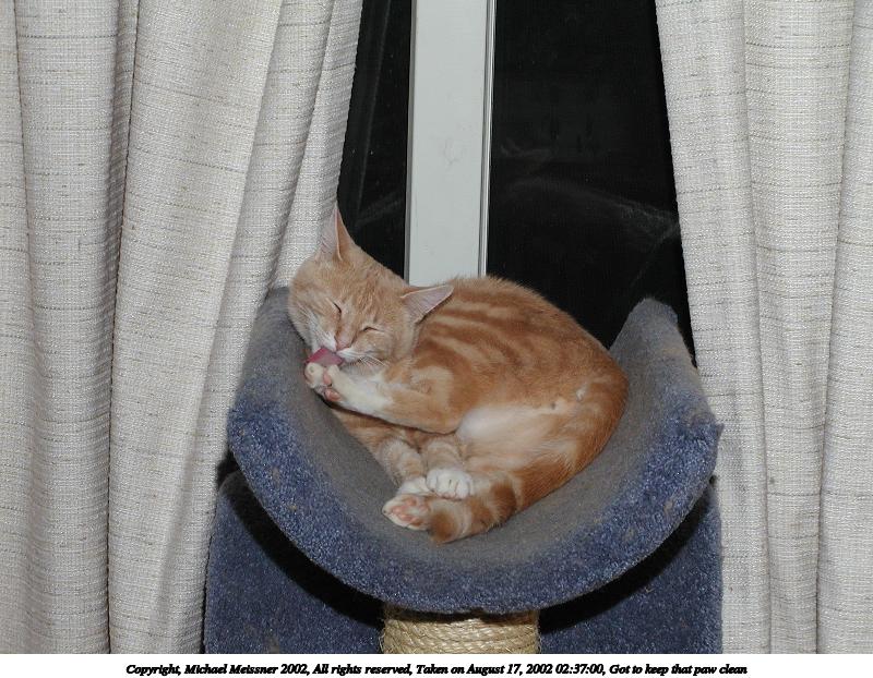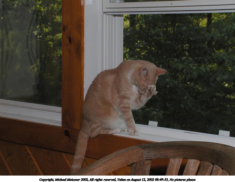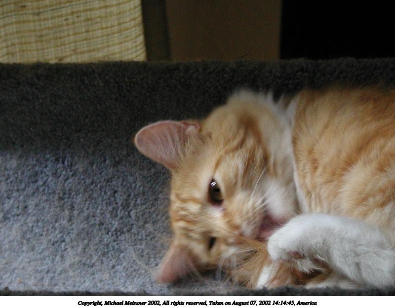 Picture #123: Got to keep that paw clean 800x622, 104,886 bytes (103K), (html file) Copyright, Michael Meissner 2002, All rights reserved Olympus C-2100UZ camera f/5.6, ISO 100, 1/125 sec, 21.5mm, manual mode, SHQ, matrix metering 35mm equivalent focal length 119.0mm Taken by Michael Meissner on August 17, 2002 02:37:00 Last modified on August 18, 2002 at 00:41 Shutter speed of 1/125 or 1/250 may indicate use of flash |