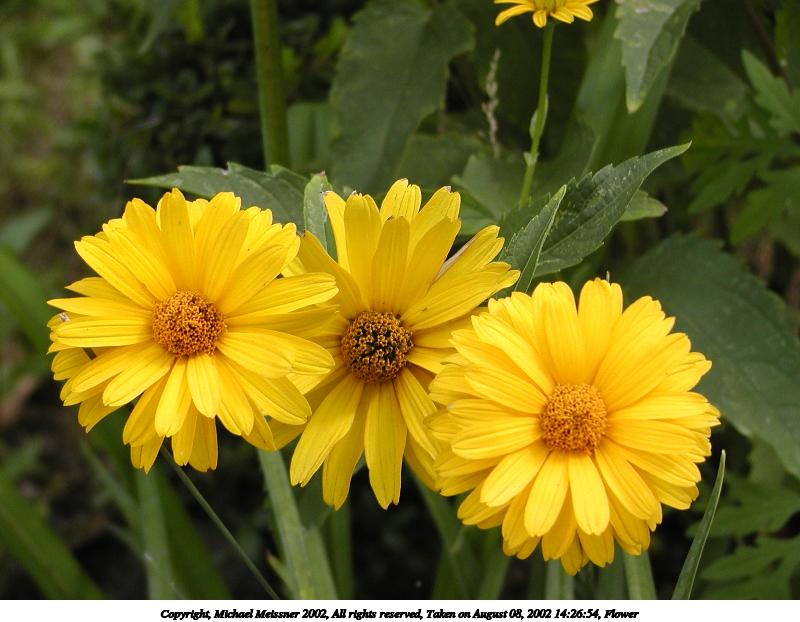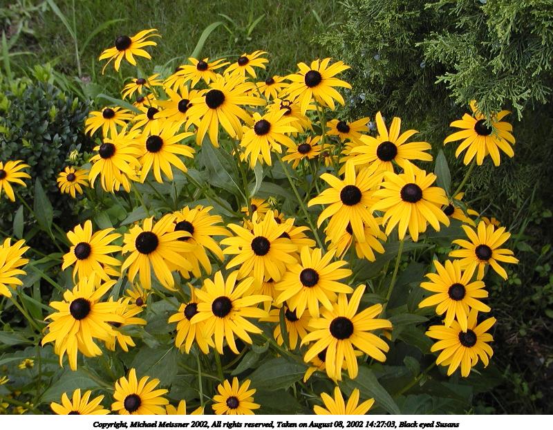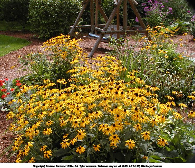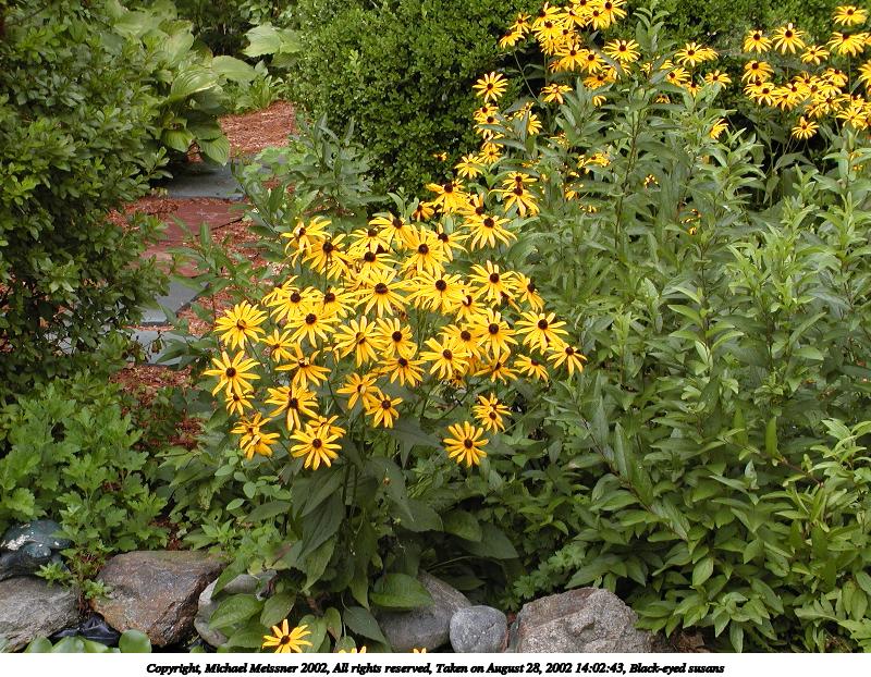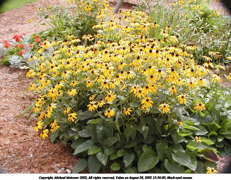 Picture #61: Black-eyed susans #2 800x687, 205,562 bytes (201K), (html file) Copyright, Michael Meissner 2002, All rights reserved Olympus C-2100UZ camera f/5.6, ISO 100, 1/250 sec, 10.5mm, s-prog mode, SHQ, matrix metering, bias -0.7 35mm equivalent focal length 58.0mm Taken by Michael Meissner on August 28, 2002 13:54:50 Last modified on August 28, 2002 at 21:13 Shutter speed of 1/125 or 1/250 may indicate use of flash |