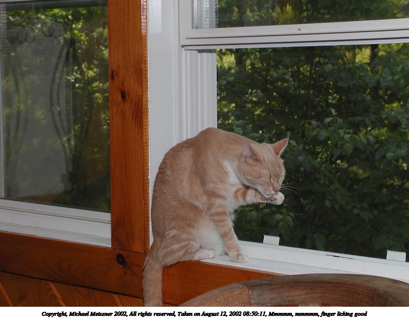 Picture #149: Mmmmm, mmmmm, finger licking good 800x622, 71,784 bytes (71K), (html file) Copyright, Michael Meissner 2002, All rights reserved Olympus C-2100UZ camera f/4.5, ISO 100, 1/125 sec, 16.8mm, manual mode, SHQ, cloudy, matrix metering 35mm equivalent focal length 93.0mm Taken by Michael Meissner on August 12, 2002 08:50:11 Last modified on August 12, 2002 at 23:23 Shutter speed of 1/125 or 1/250 may indicate use of flash |