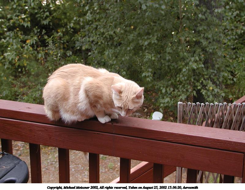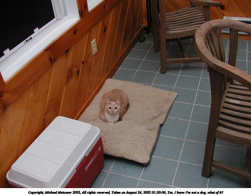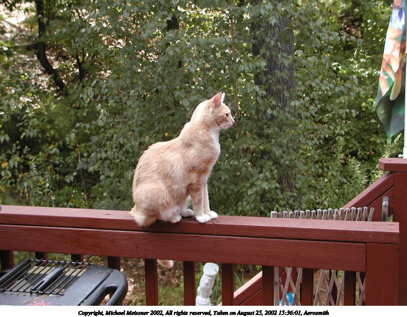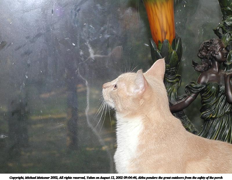 Picture #145: Abba ponders the great outdoors from the safety of the porch 800x622, 91,759 bytes (90K), (html file) Copyright, Michael Meissner 2002, All rights reserved Olympus C-2100UZ camera f/5.0, ISO 100, 1/125 sec, 25.2mm, manual mode, SHQ, matrix metering 35mm equivalent focal length 140.0mm Taken by Michael Meissner on August 12, 2002 09:04:46 Last modified on August 12, 2002 at 23:28 Shutter speed of 1/125 or 1/250 may indicate use of flash |