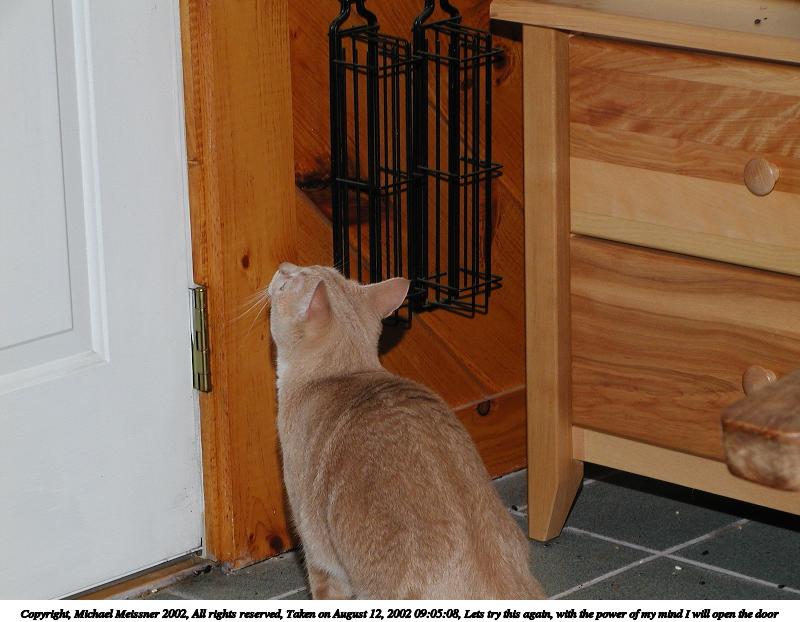 Picture #148: With the power of my mind, I will open the door 800x622, 63,857 bytes (63K), (html file) Copyright, Michael Meissner 2002, All rights reserved Olympus C-2100UZ camera f/5.6, ISO 100, 1/125 sec, 25.2mm, manual mode, SHQ, matrix metering 35mm equivalent focal length 140.0mm Taken by Michael Meissner on August 12, 2002 09:01:54 Last modified on August 12, 2002 at 23:24 Shutter speed of 1/125 or 1/250 may indicate use of flash |