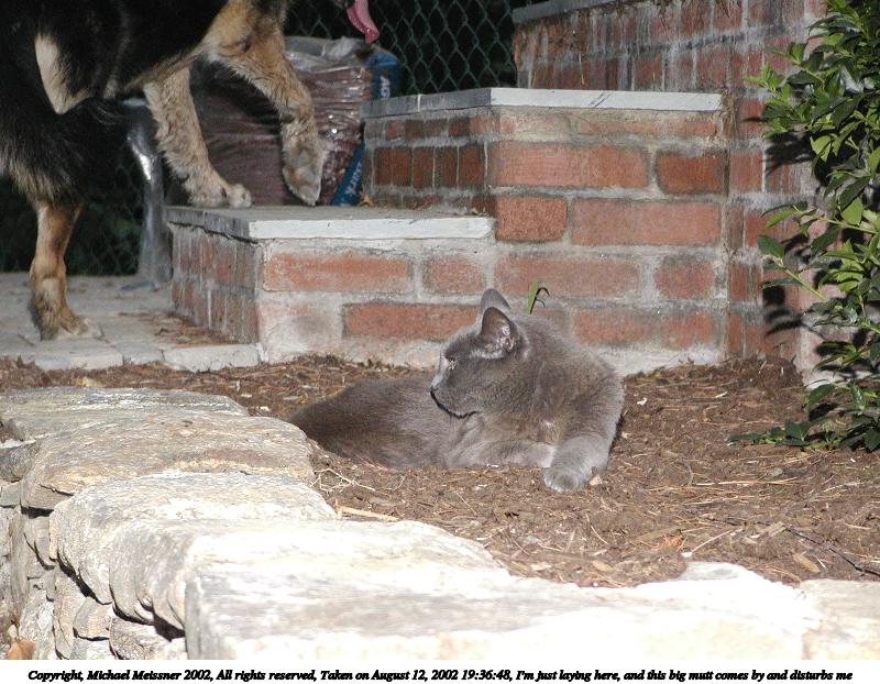 Picture #141: I'm just laying here, and this big mutt comes by and disturbs me 800x622, 111,886 bytes (110K), (html file) Copyright, Michael Meissner 2002, All rights reserved Olympus C-2100UZ camera f/3.2, ISO 400, 1/125 sec, 28.5mm, manual mode, SHQ, cloudy, matrix metering 35mm equivalent focal length 158.0mm Taken by Michael Meissner on August 12, 2002 19:36:48 Last modified on August 12, 2002 at 23:38 Shutter speed of 1/125 or 1/250 may indicate use of flash |