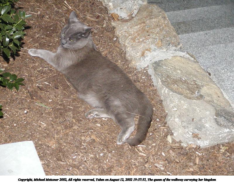 Picture #140: The queen of the walkway surveying her kingdom 800x622, 137,435 bytes (135K), (html file) Copyright, Michael Meissner 2002, All rights reserved Olympus C-2100UZ camera f/3.2, ISO 400, 1/125 sec, 20.7mm, manual mode, SHQ, cloudy, matrix metering 35mm equivalent focal length 115.0mm Taken by Michael Meissner on August 12, 2002 19:37:35 Last modified on August 12, 2002 at 23:39 Shutter speed of 1/125 or 1/250 may indicate use of flash |