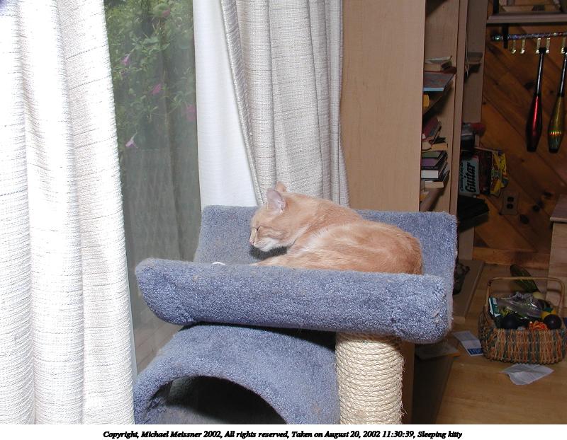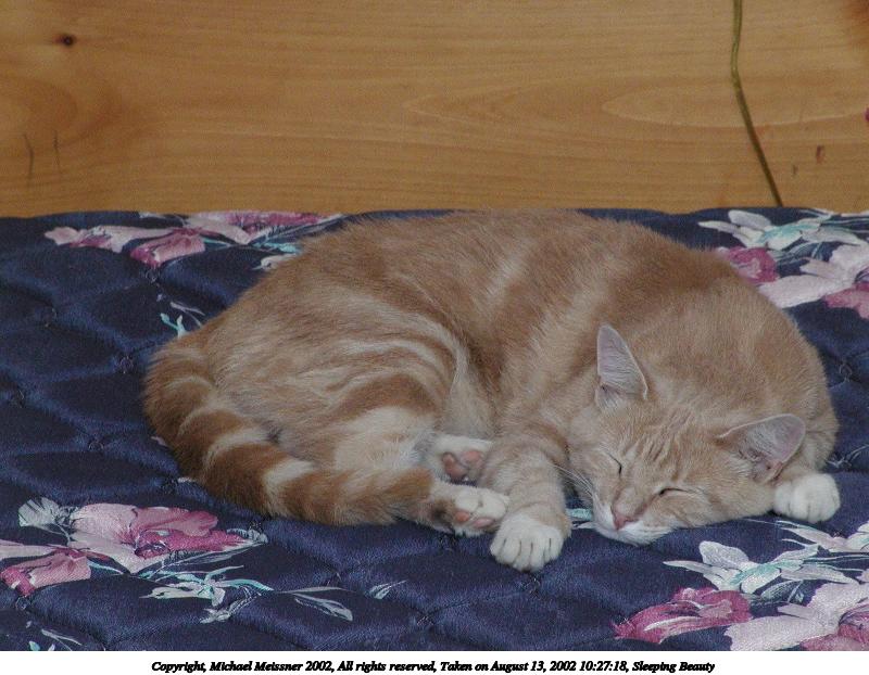Picture #138: Sleeping Beauty 800x622, 81,875 bytes (80K), (html file) Copyright, Michael Meissner 2002, All rights reserved Olympus C-2100UZ camera f/5.6, ISO 400, 1/125 sec, 45.8mm, manual mode, SHQ, matrix metering 35mm equivalent focal length 254.0mm Taken by Michael Meissner on August 13, 2002 10:27:18 Last modified on August 13, 2002 at 16:15 Shutter speed of 1/125 or 1/250 may indicate use of flash |