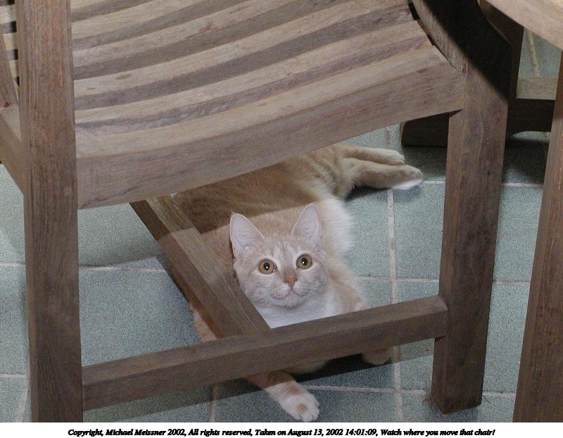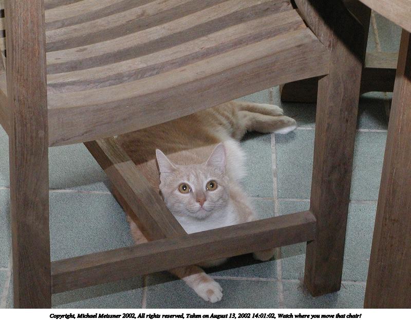 Picture #135: Watch where you move that chair! #2 800x622, 83,727 bytes (82K), (html file) Copyright, Michael Meissner 2002, All rights reserved Olympus C-2100UZ camera f/5.6, ISO 400, 1/125 sec, 23.2mm, manual mode, SHQ, matrix metering 35mm equivalent focal length 129.0mm Taken by Michael Meissner on August 13, 2002 14:01:09 Last modified on August 13, 2002 at 16:23 Shutter speed of 1/125 or 1/250 may indicate use of flash |