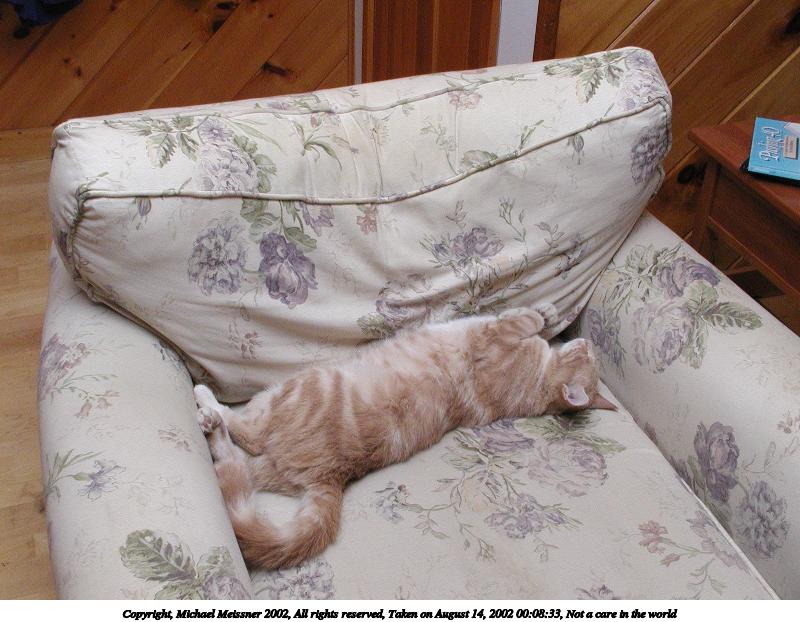 Picture #131: Not a care in the world 800x622, 84,186 bytes (83K), (html file) Copyright, Michael Meissner 2002, All rights reserved Olympus C-2100UZ camera f/8.0, ISO 400, 1/60 sec, 8.4mm, manual mode, SHQ, matrix metering 35mm equivalent focal length 47.0mm Taken by Michael Meissner on August 14, 2002 00:08:33 Last modified on August 14, 2002 at 15:47 |
