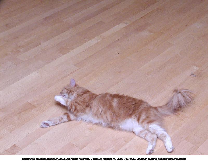Picture #152: Purrgatory 800x622, 115,865 bytes (114K), (html file) Copyright, Michael Meissner 2002, All rights reserved Olympus C-2100UZ camera f/3.5, ISO 100, 1/125 sec, 25.2mm, manual mode, SHQ, matrix metering 35mm equivalent focal length 140.0mm Taken by Michael Meissner on August 08, 2002 19:34:59 Last modified on August 09, 2002 at 01:20 Shutter speed of 1/125 or 1/250 may indicate use of flash |