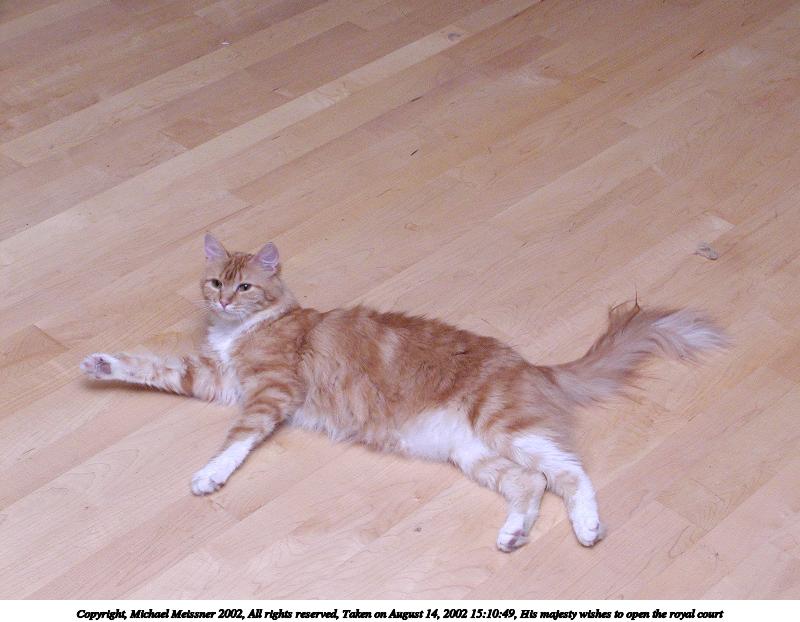 Picture #128: His majesty wishes to open the royal court 800x622, 61,277 bytes (60K), (html file) Copyright, Michael Meissner 2002, All rights reserved Olympus C-2100UZ camera f/5.6, ISO 400, 1/125 sec, 13.0mm, manual mode, SHQ, matrix metering 35mm equivalent focal length 72.0mm Taken by Michael Meissner on August 14, 2002 15:10:49 Last modified on August 14, 2002 at 15:56 Shutter speed of 1/125 or 1/250 may indicate use of flash |