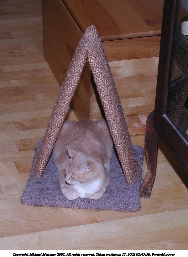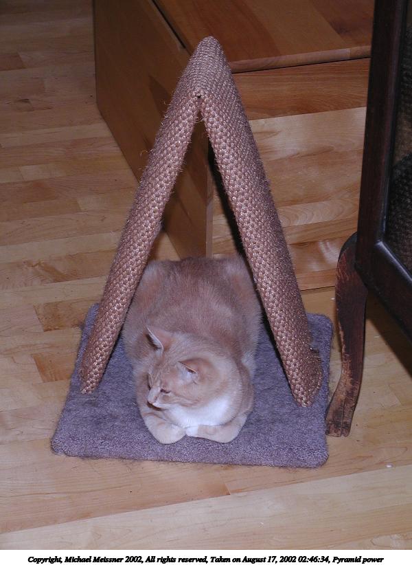Picture #121: Pyramid power #2 600x822, 77,718 bytes (76K), (html file) Copyright, Michael Meissner 2002, All rights reserved Olympus C-2100UZ camera f/5.0, ISO 100, 1/125 sec, 20.0mm, manual mode, SHQ, matrix metering 35mm equivalent focal length 111.0mm Taken by Michael Meissner on August 17, 2002 02:46:34 Last modified on August 18, 2002 at 00:44 Shutter speed of 1/125 or 1/250 may indicate use of flash |