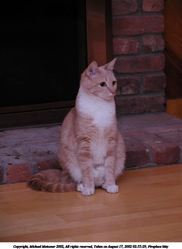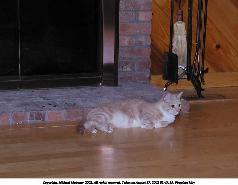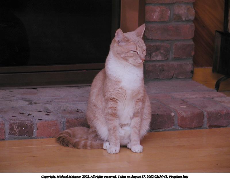 Picture #115: Fireplace kitty #4 600x822, 50,847 bytes (50K), (html file) Copyright, Michael Meissner 2002, All rights reserved Olympus C-2100UZ camera f/2.8, ISO 100, 1/125 sec, 32.5mm, manual mode, SHQ, matrix metering 35mm equivalent focal length 180.0mm Taken by Michael Meissner on August 17, 2002 02:55:29 Last modified on August 18, 2002 at 00:54 Shutter speed of 1/125 or 1/250 may indicate use of flash |