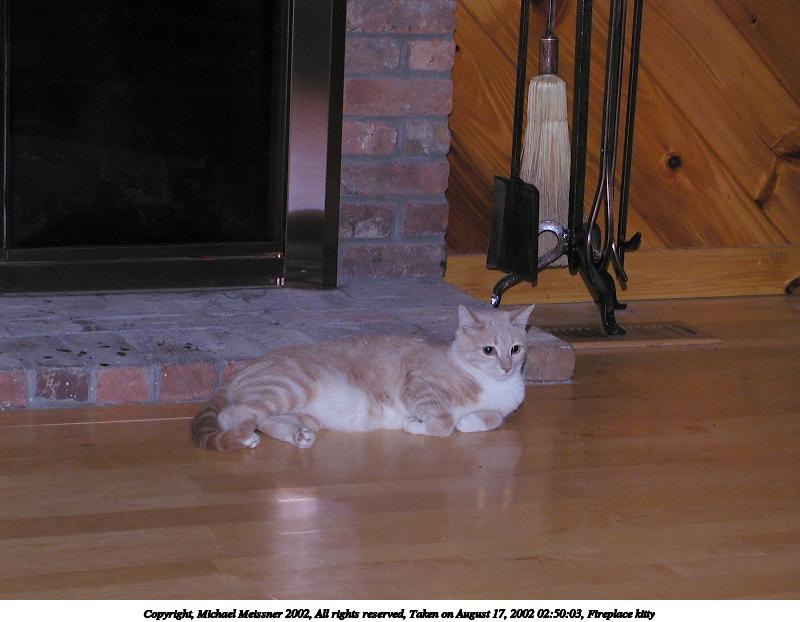 Picture #117: Fireplace kitty #3 800x622, 52,400 bytes (52K), (html file) Copyright, Michael Meissner 2002, All rights reserved Olympus C-2100UZ camera f/2.8, ISO 100, 1/125 sec, 32.5mm, manual mode, SHQ, matrix metering 35mm equivalent focal length 180.0mm Taken by Michael Meissner on August 17, 2002 02:54:48 Last modified on August 18, 2002 at 00:50 Shutter speed of 1/125 or 1/250 may indicate use of flash |