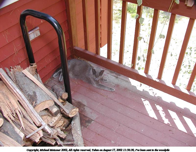 Picture #114: I've been sent to the woodpile 800x622, 107,337 bytes (105K), (html file) Copyright, Michael Meissner 2002, All rights reserved Olympus C-2100UZ camera f/2.8, ISO 100, 1/125 sec, 7.0mm, manual mode, SHQ, matrix metering 35mm equivalent focal length 39.0mm Taken by Michael Meissner on August 17, 2002 11:56:30 Last modified on August 18, 2002 at 00:56 Shutter speed of 1/125 or 1/250 may indicate use of flash |