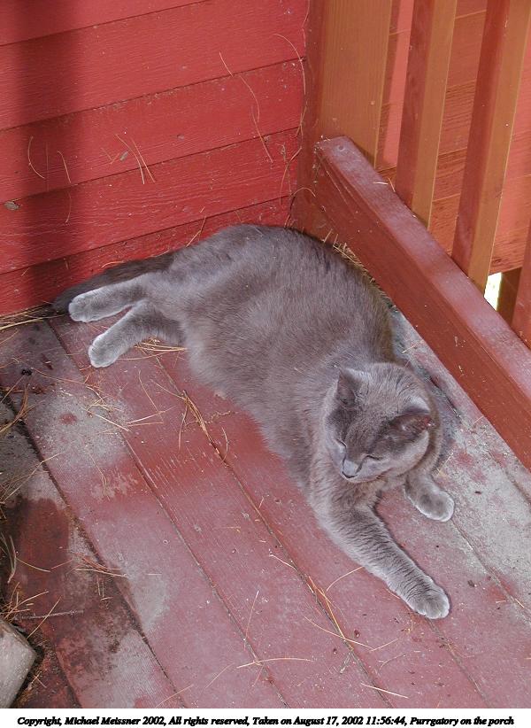 Picture #113: Purrgatory on the porch 600x822, 93,145 bytes (91K), (html file) Copyright, Michael Meissner 2002, All rights reserved Olympus C-2100UZ camera f/2.8, ISO 100, 1/125 sec, 16.8mm, manual mode, SHQ, matrix metering 35mm equivalent focal length 93.0mm Taken by Michael Meissner on August 17, 2002 11:56:44 Last modified on August 18, 2002 at 00:57 Shutter speed of 1/125 or 1/250 may indicate use of flash |