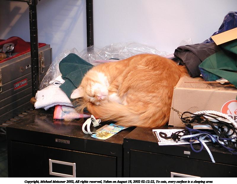 Picture #108: To cats, every surface is a sleeping area 800x622, 81,040 bytes (80K), (html file) Copyright, Michael Meissner 2002, All rights reserved Olympus C-2100UZ camera f/2.8, ISO 100, 1/6 sec, 22.3mm, auto mode, SHQ, matrix metering 35mm equivalent focal length 124.0mm Taken by Michael Meissner on August 18, 2002 02:12:22 Last modified on August 19, 2002 at 00:15 |