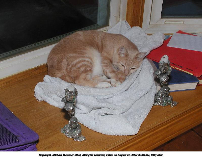 Picture #86: Kitty altar #8 800x622, 74,820 bytes (74K), (html file) Copyright, Michael Meissner 2002, All rights reserved Olympus C-2100UZ camera f/3.2, ISO 100, 1/125 sec, 12.0mm, manual mode, SHQ, matrix metering 35mm equivalent focal length 67.0mm Taken by Michael Meissner on August 20, 2002 21:39:24 Last modified on August 21, 2002 at 00:25 Shutter speed of 1/125 or 1/250 may indicate use of flash |