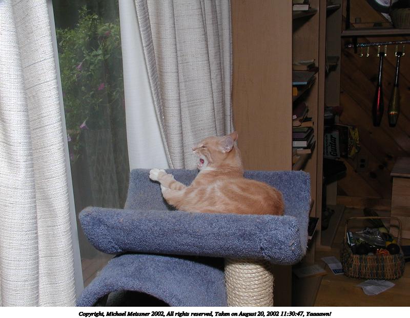 Picture #194: I'm bored 800x622, 112,214 bytes (110K), (html file) Copyright, Michael Meissner 2002, All rights reserved Olympus C-2100UZ camera f/2.8, ISO 100, 1/100 sec, 43.5mm, auto mode, SHQ, matrix metering 35mm equivalent focal length 241.0mm Taken by Michael Meissner on August 04, 2002 14:46:01 Last modified on August 04, 2002 at 18:02 |