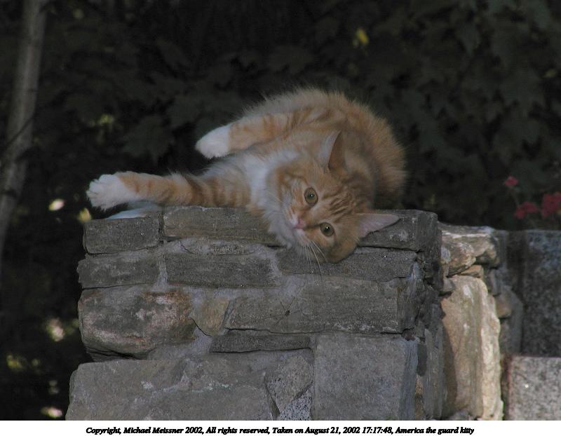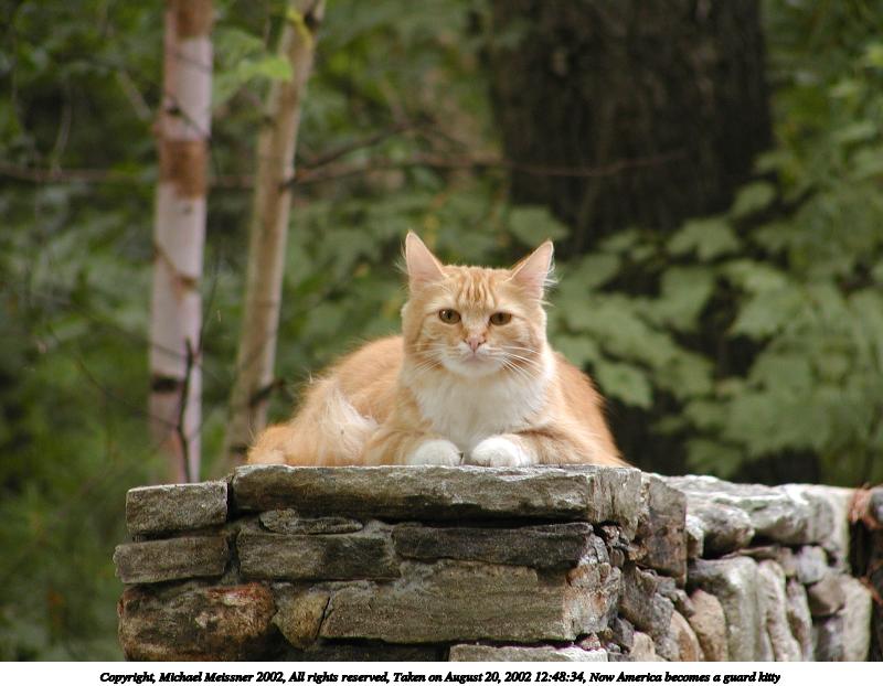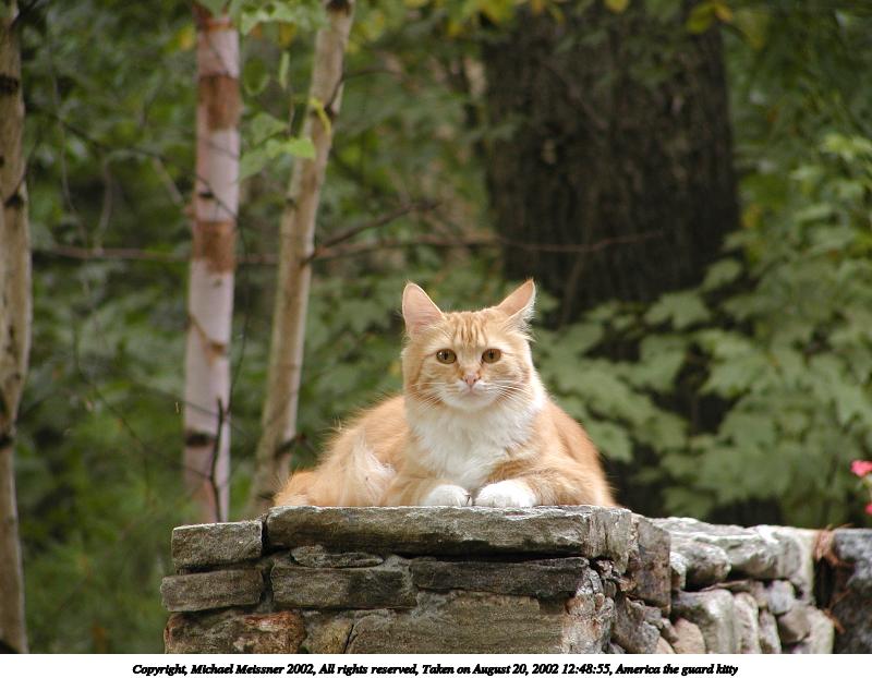 Picture #85: America the guard kitty #4 800x622, 63,169 bytes (62K), (html file) Copyright, Michael Meissner 2002, All rights reserved Olympus C-2100UZ camera f/5.6, ISO 100, 1/125 sec, 57.3mm, manual mode, SHQ, matrix metering 35mm equivalent focal length 318.0mm Taken by Michael Meissner on August 21, 2002 17:17:48 Last modified on August 21, 2002 at 17:26 Shutter speed of 1/125 or 1/250 may indicate use of flash |