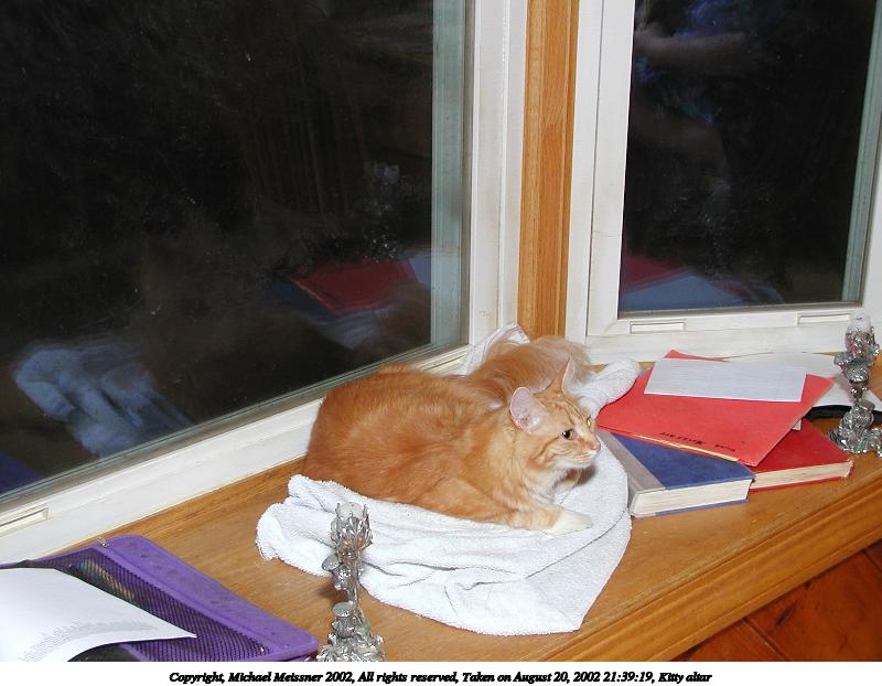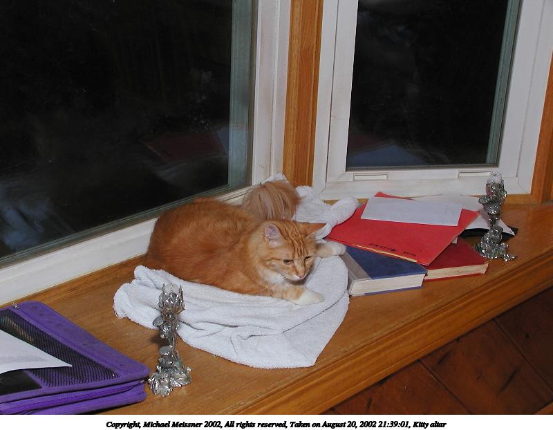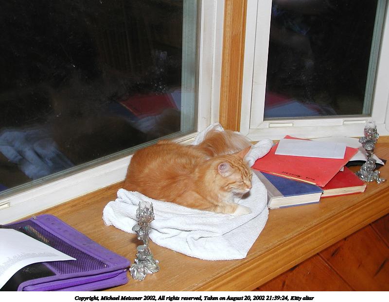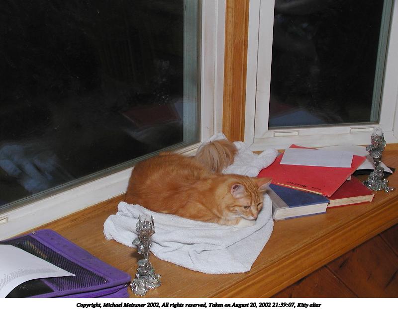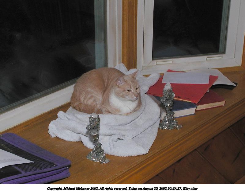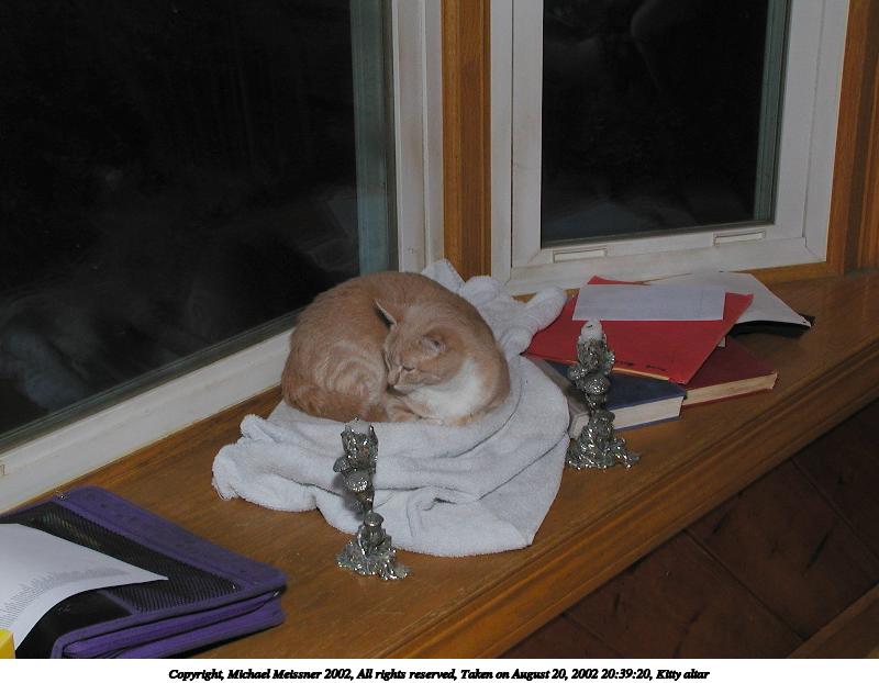 Picture #91: Kitty altar #3 800x622, 57,886 bytes (57K), (html file) Copyright, Michael Meissner 2002, All rights reserved Olympus C-2100UZ camera f/5.6, ISO 100, 1/125 sec, 12.3mm, manual mode, SHQ, matrix metering 35mm equivalent focal length 68.0mm Taken by Michael Meissner on August 20, 2002 20:39:20 Last modified on August 21, 2002 at 00:20 Shutter speed of 1/125 or 1/250 may indicate use of flash |