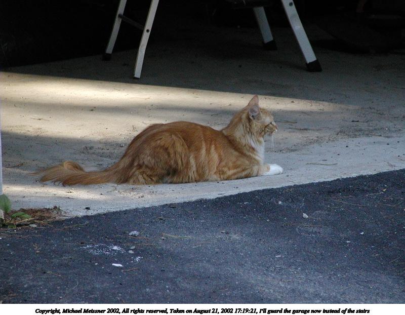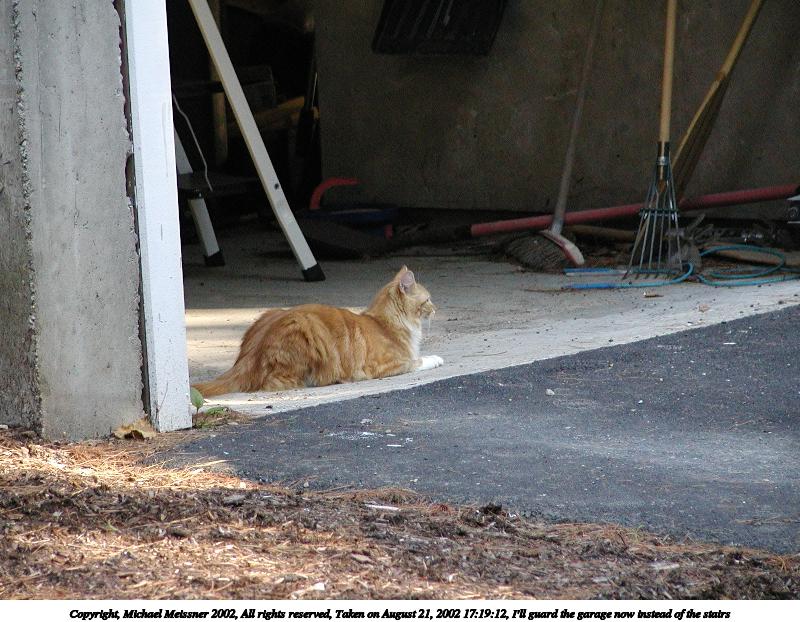 Picture #84: I'll guard the garage now instead of the stairs 800x622, 107,340 bytes (105K), (html file) Copyright, Michael Meissner 2002, All rights reserved Olympus C-2100UZ camera f/2.8, ISO 400, 1/160 sec, 39.3mm, auto mode, SHQ, matrix metering 35mm equivalent focal length 218.0mm Taken by Michael Meissner on August 21, 2002 17:19:12 Last modified on August 21, 2002 at 17:27 |