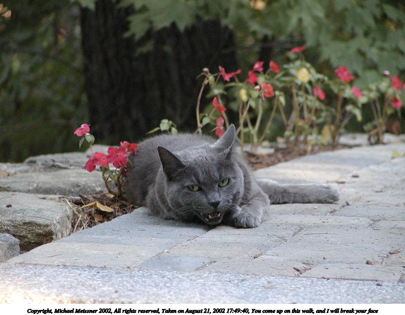 Picture #82: You come up on this walk, and I will break your face 800x622, 86,313 bytes (85K), (html file) Copyright, Michael Meissner 2002, All rights reserved Olympus C-2100UZ camera f/2.8, ISO 400, 1/100 sec, 41.3mm, auto mode, SHQ, matrix metering 35mm equivalent focal length 229.0mm Taken by Michael Meissner on August 21, 2002 17:49:40 Last modified on August 24, 2002 at 15:07 |