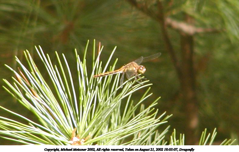 Picture #78: Dragonfly 786x500, 69,394 bytes (68K), (html file) Copyright, Michael Meissner 2002, All rights reserved Olympus C-2100UZ camera f/3.2, ISO 100, 1/125 sec, 61.0mm, auto mode, SHQ, center weight metering 35mm equivalent focal length 338.0mm Taken by Michael Meissner on August 21, 2002 18:03:07 Last modified on August 24, 2002 at 21:22 Shutter speed of 1/125 or 1/250 may indicate use of flash |